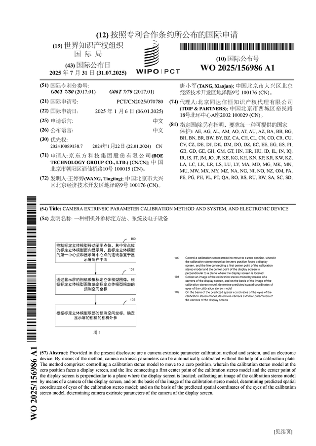 证券之星消息,根据企查查数据显示京东方A(000725)公布了一项国际专利申请,专利名为“一种相机外参标定方法、系统及电子设备”,专利申请号为PCT/CN2025/070780,国际公布日为2025年7月31日。